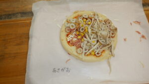 今回も、具沢山ピザだったり、目を付けたりなど顔風にトッピングしてみたり、キノコが苦手な子用に