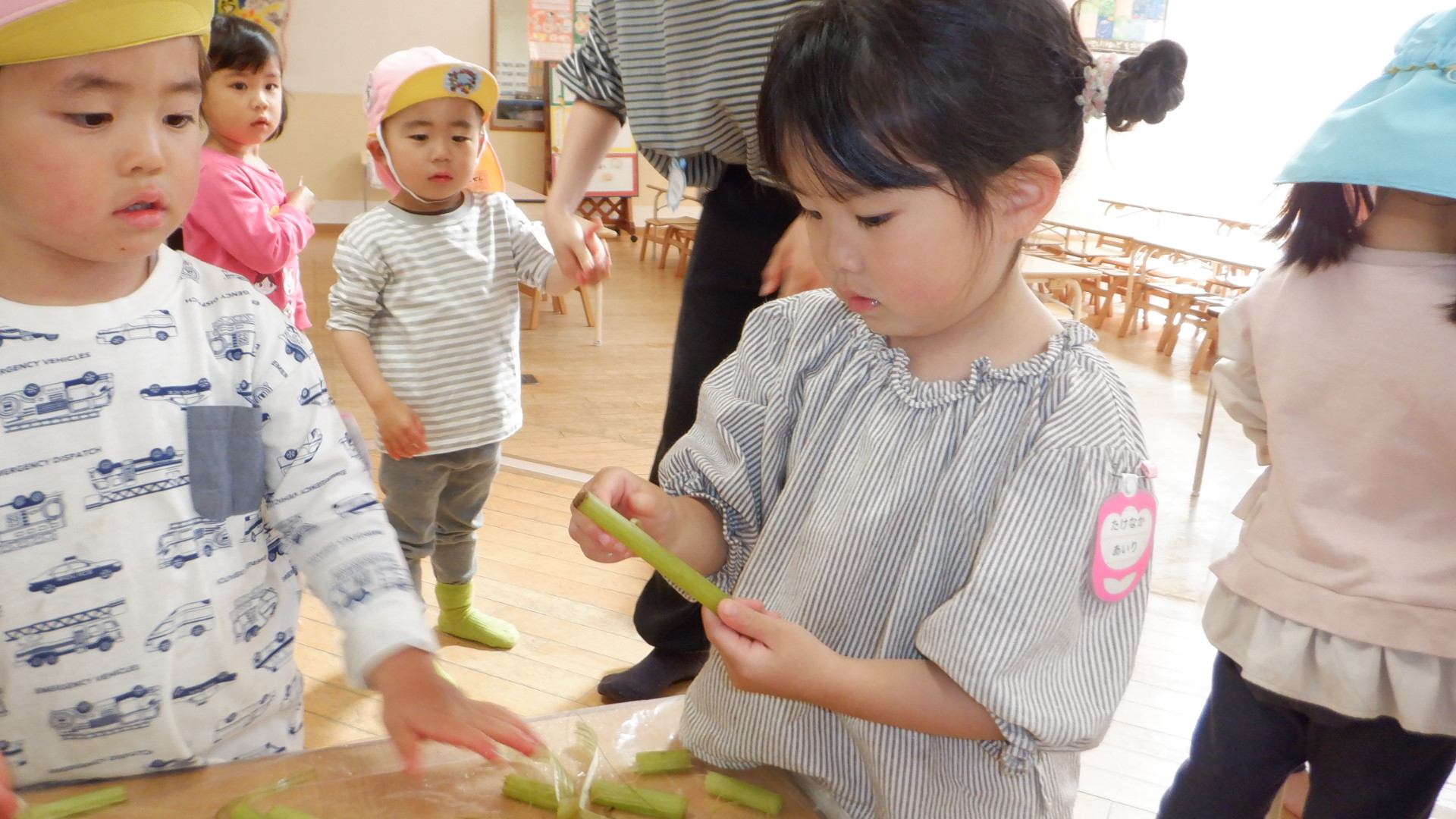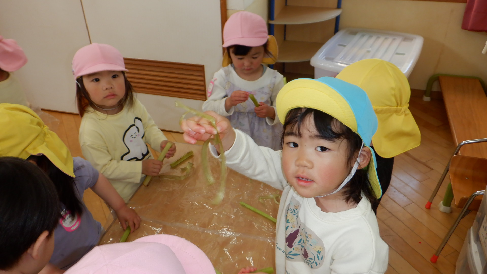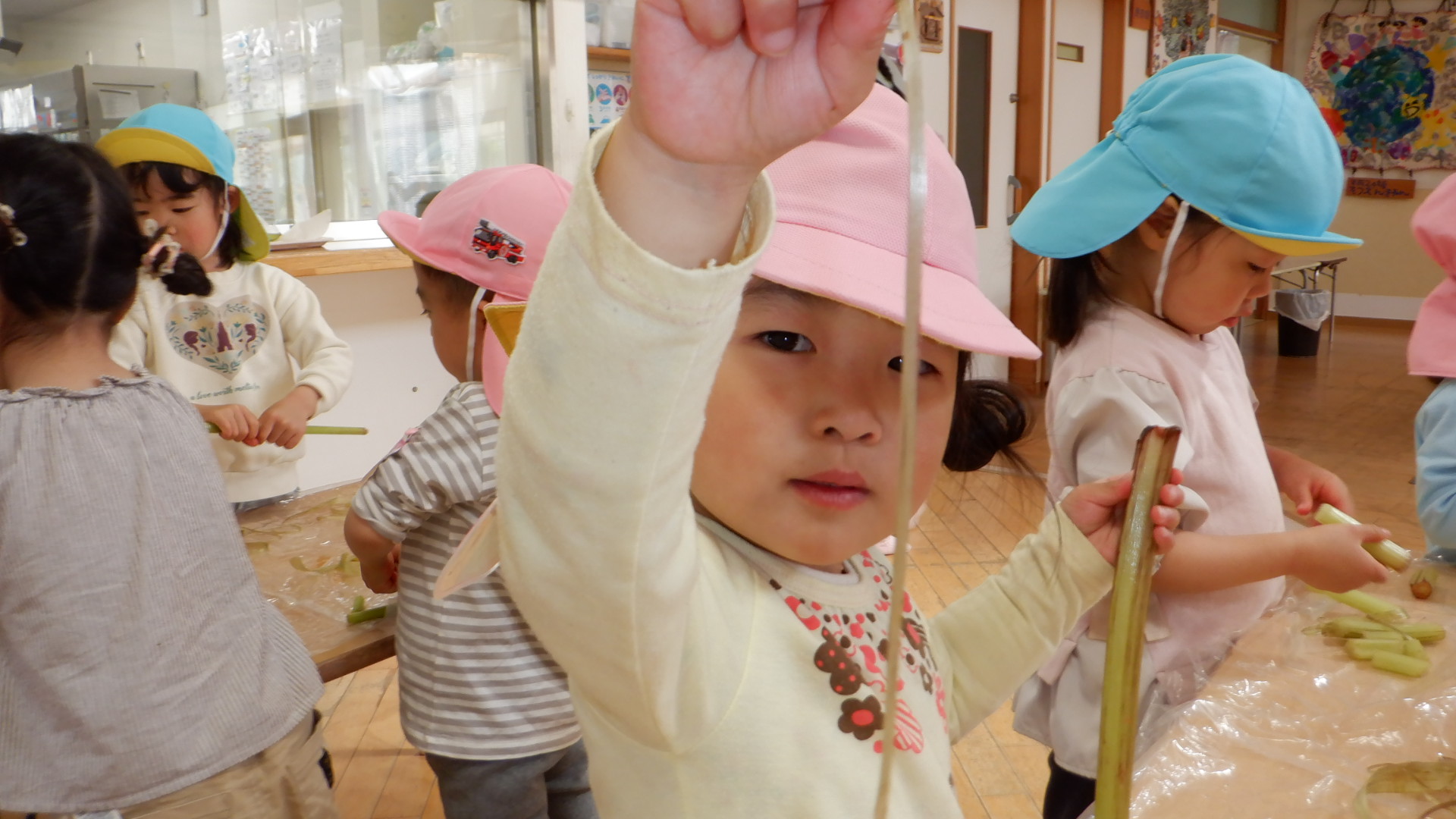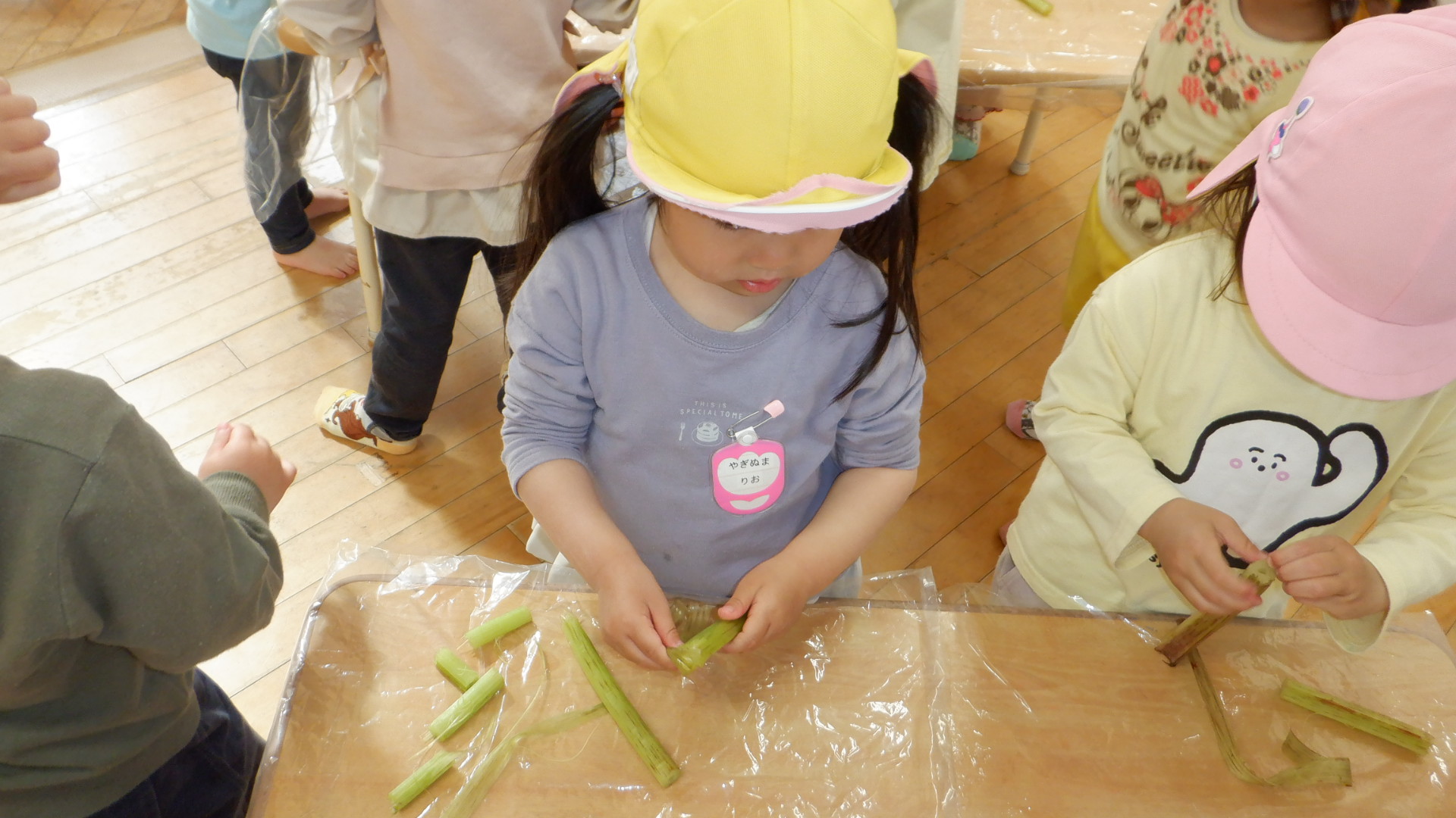 次は、わくわくさん中心になり“ふき”のスジ取りをしたい子に集まってもらいました。