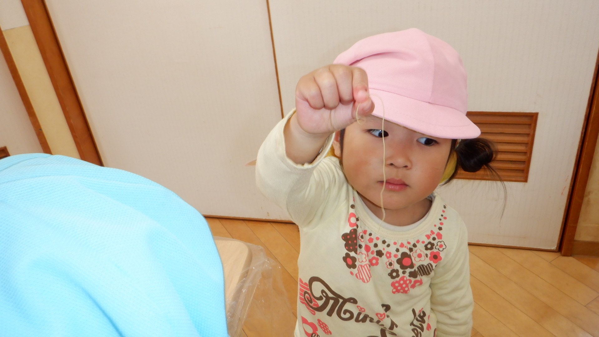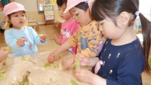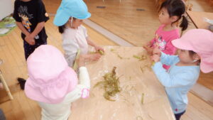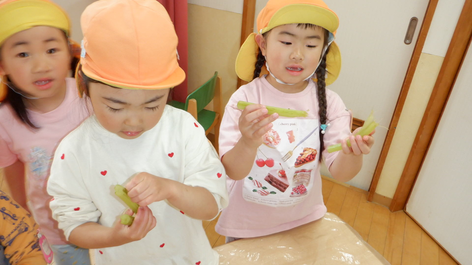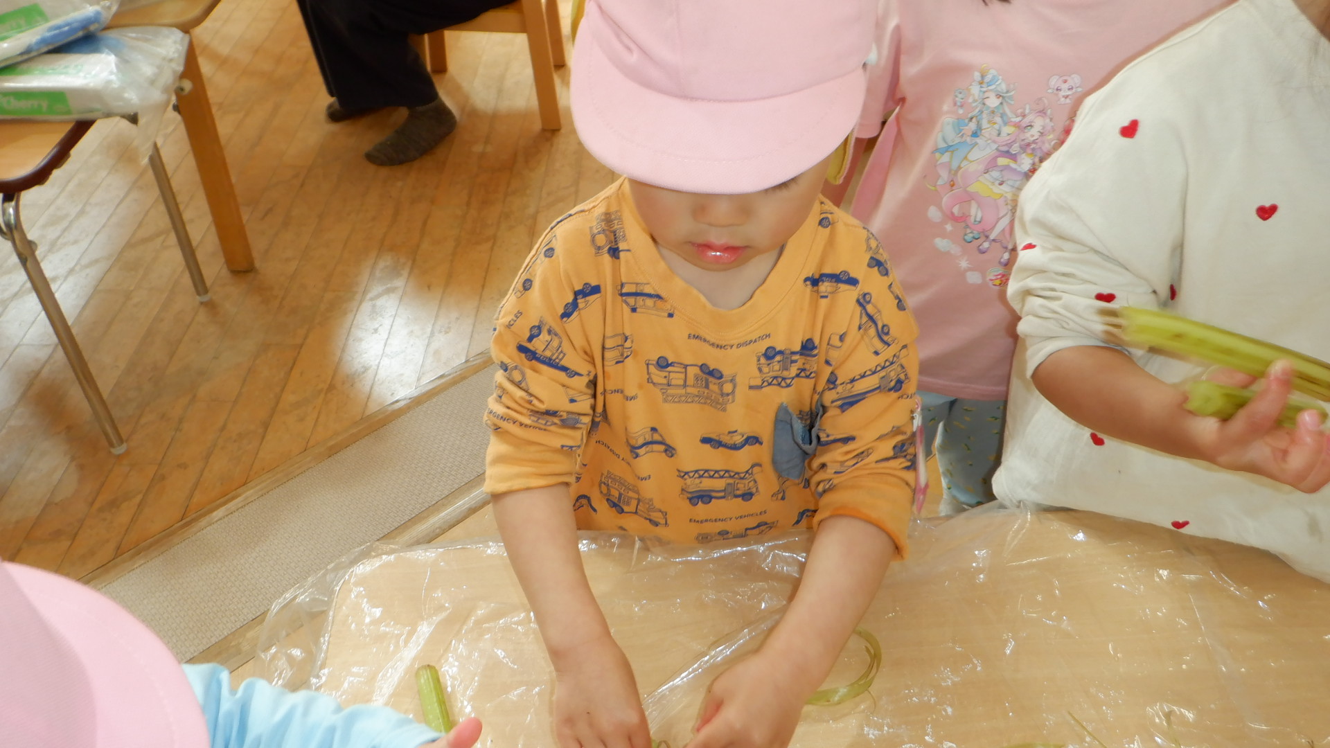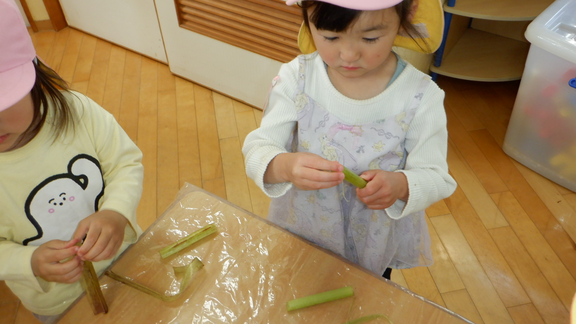 次は、わくわくさん中心になり“ふき”のスジ取りをしたい子に集まってもらいました。