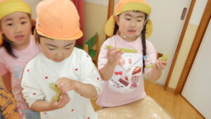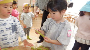 周りのお友だちと協力しながら皮をむいたり、頑張って一人でむいたり、