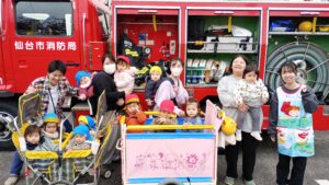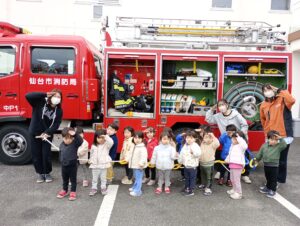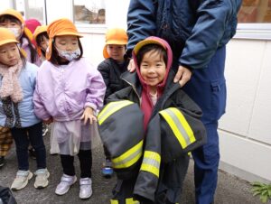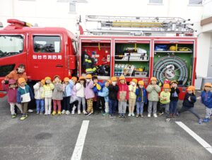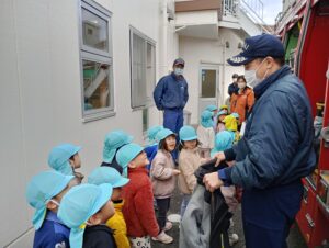 避難の様子を消防士さんに見ていただき、いつも通り速やかに園外から園庭へ避難することができました。