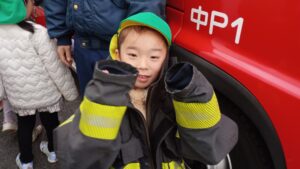 小さいクラスでも消防車は大人気なので、大きな真っ赤な消防車を近くで見て目を輝かせていました。