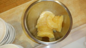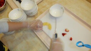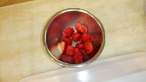 最初にイチゴとパイナップルをたべやすい大きさに切ります。