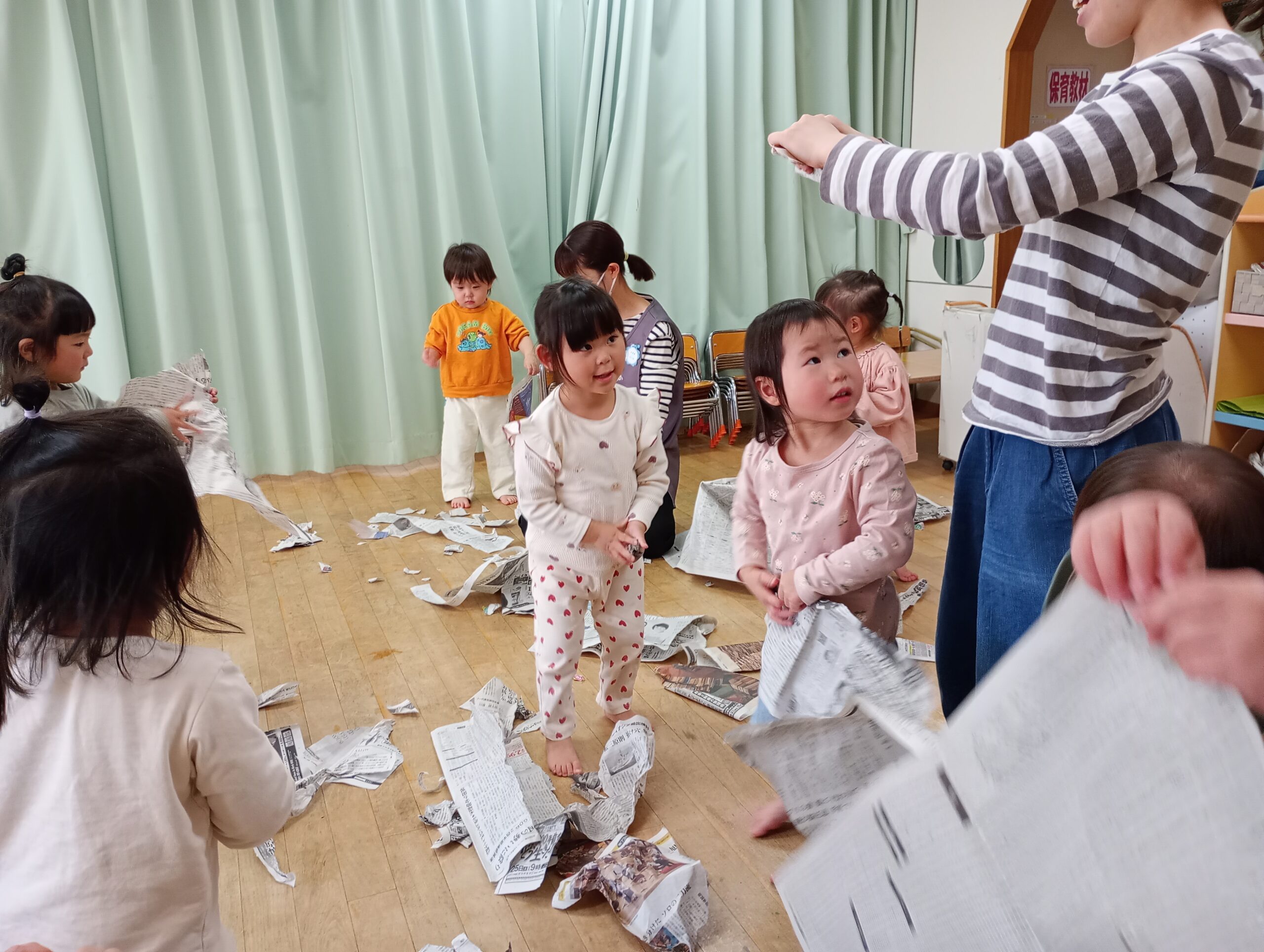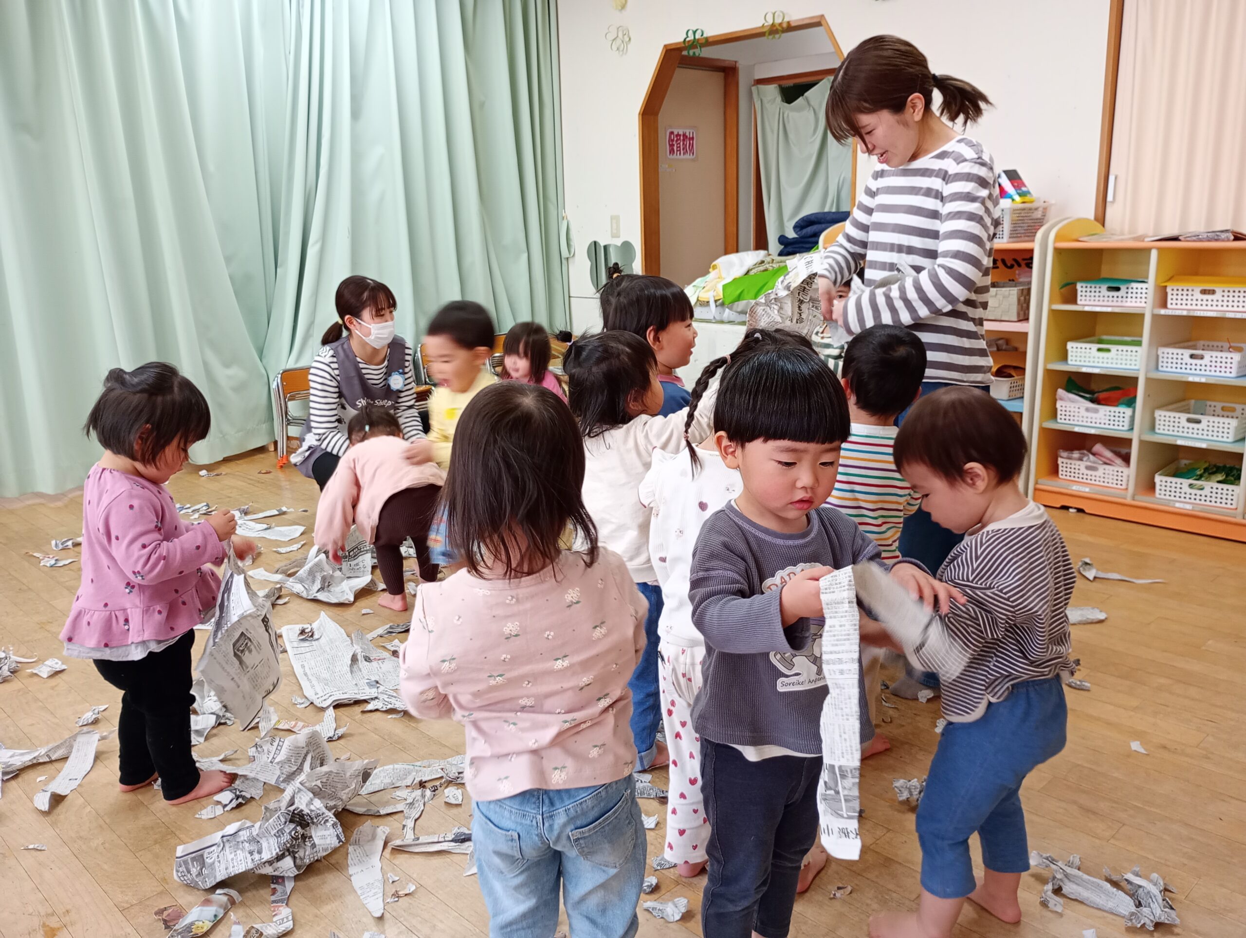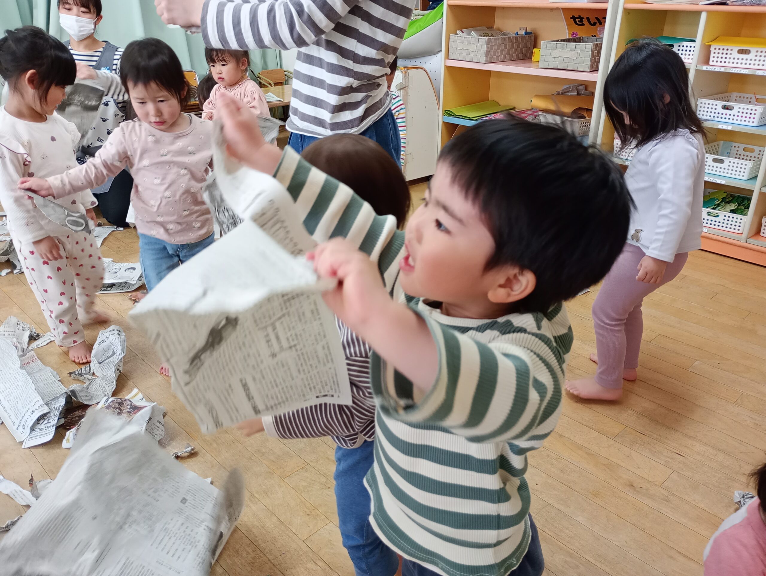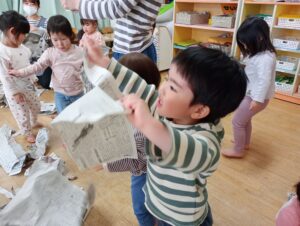 今年の園のテーマは「音を感じよう」です♪ 新聞紙遊びのなかでも、保育者が「どんな音がする~?」「ビリビリ