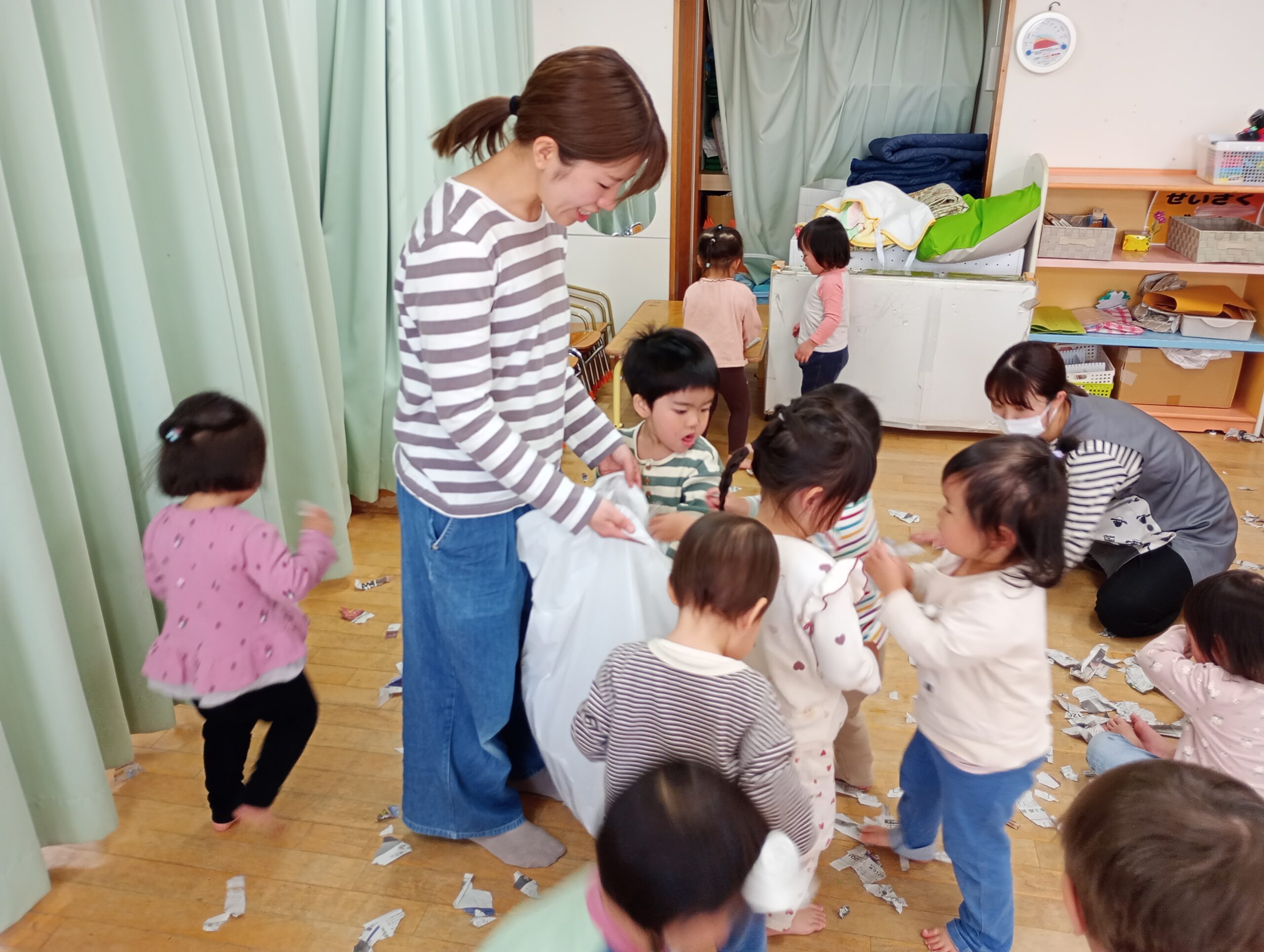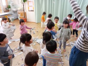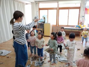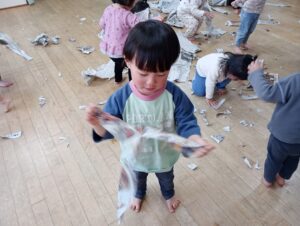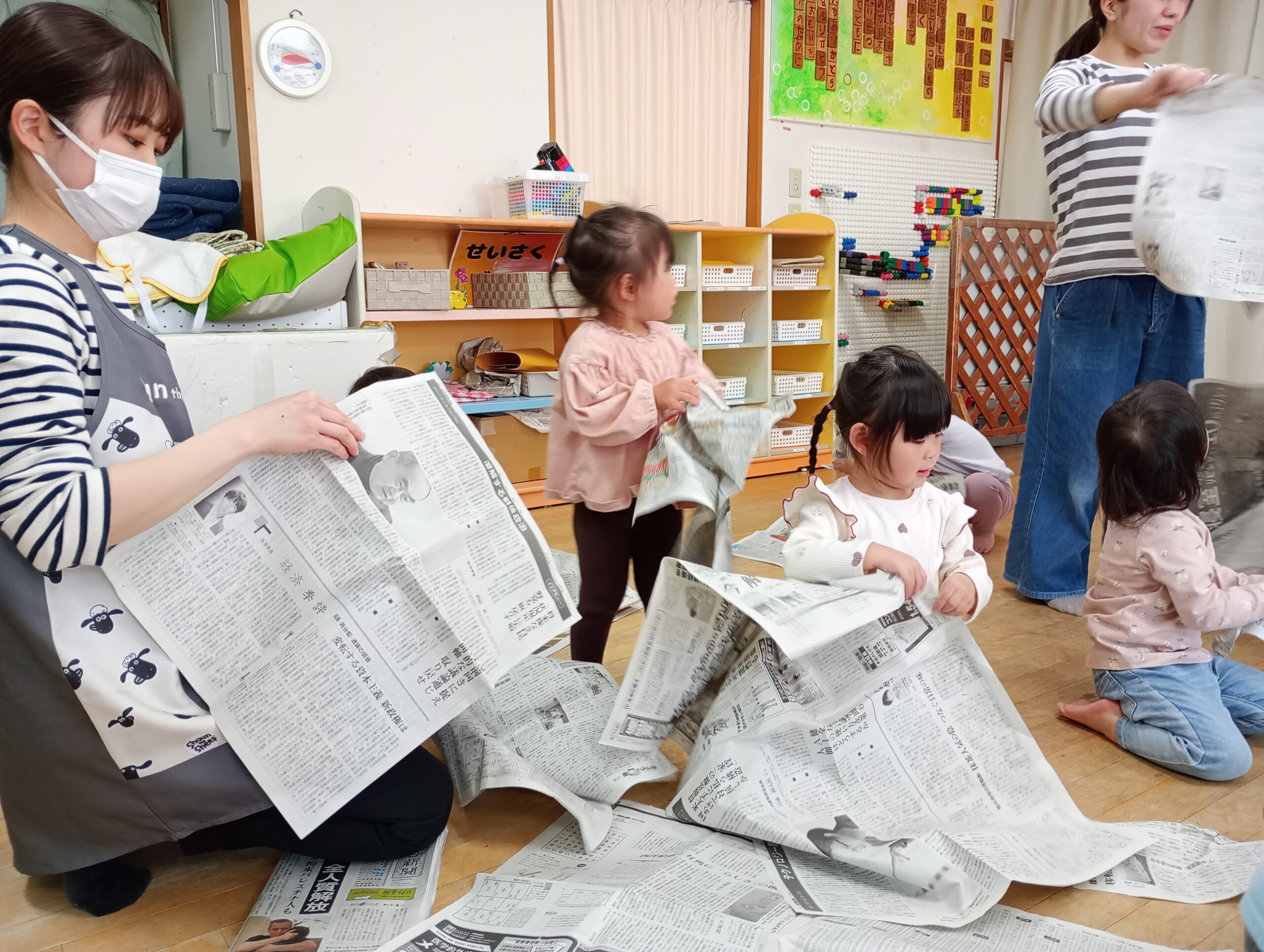 今年の園のテーマは「音を感じよう」です♪ 新聞紙遊びのなかでも、保育者が「どんな音がする~?」「ビリビリ