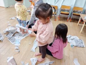 お部屋で新聞紙遊びを楽しんだきさきらさん。触ったり、ちぎったり、丸めたり、感触も楽しみました!