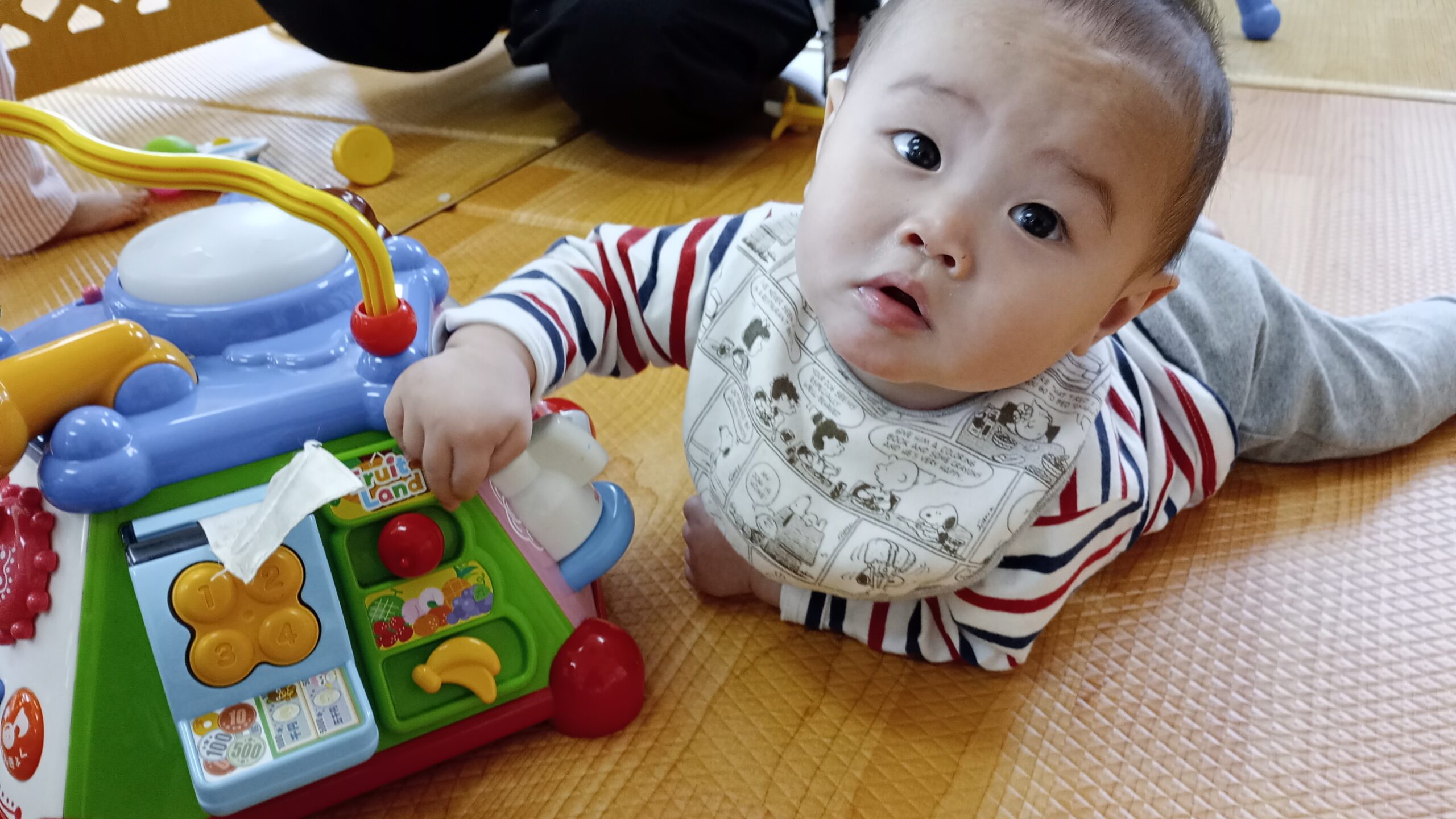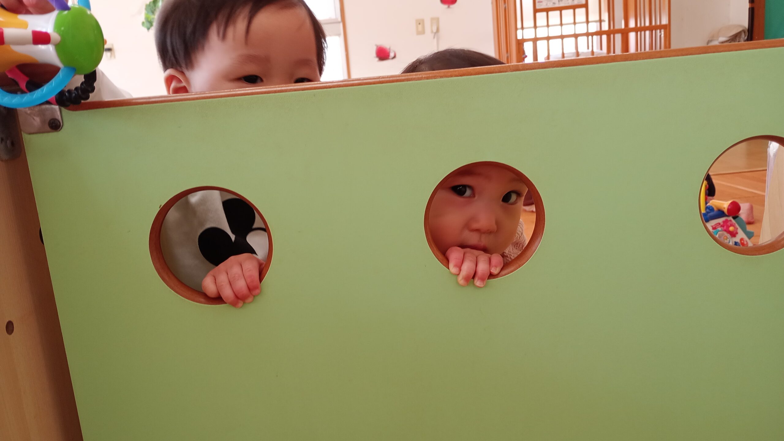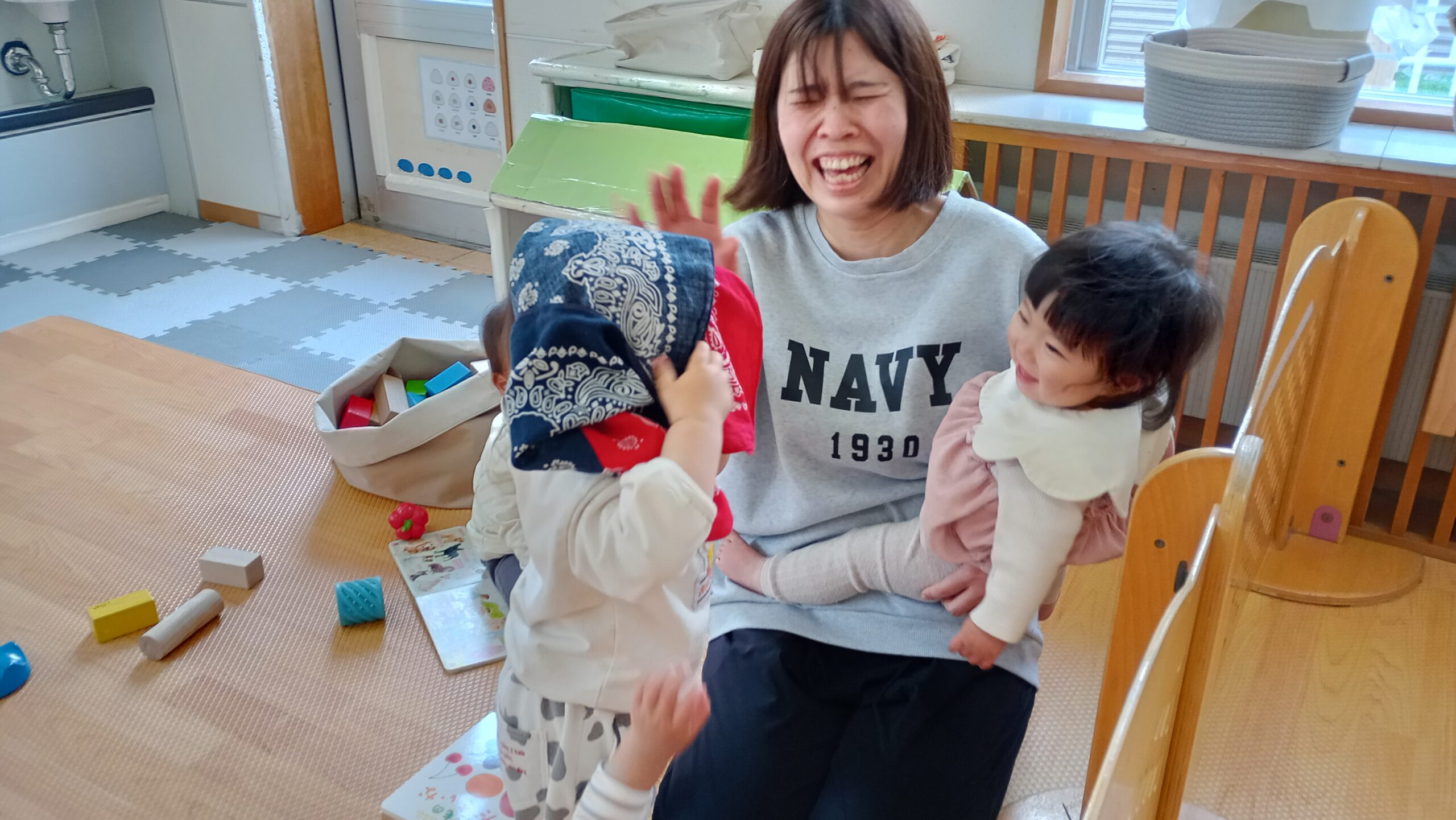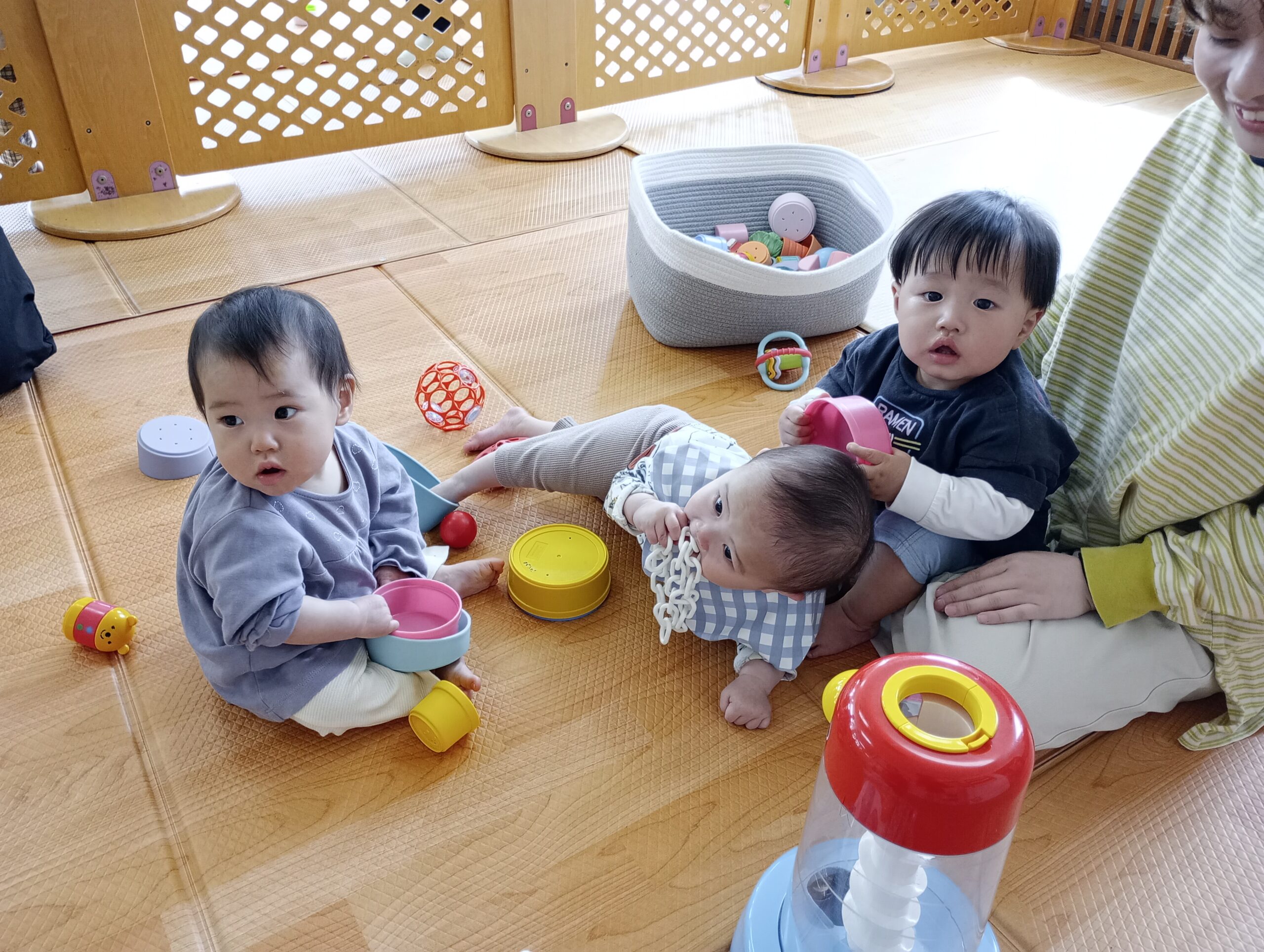 ぴよぴよさんのお友だちがおもちゃを持ってきてくれたり、いないいないばぁで笑わせてくれています😊
