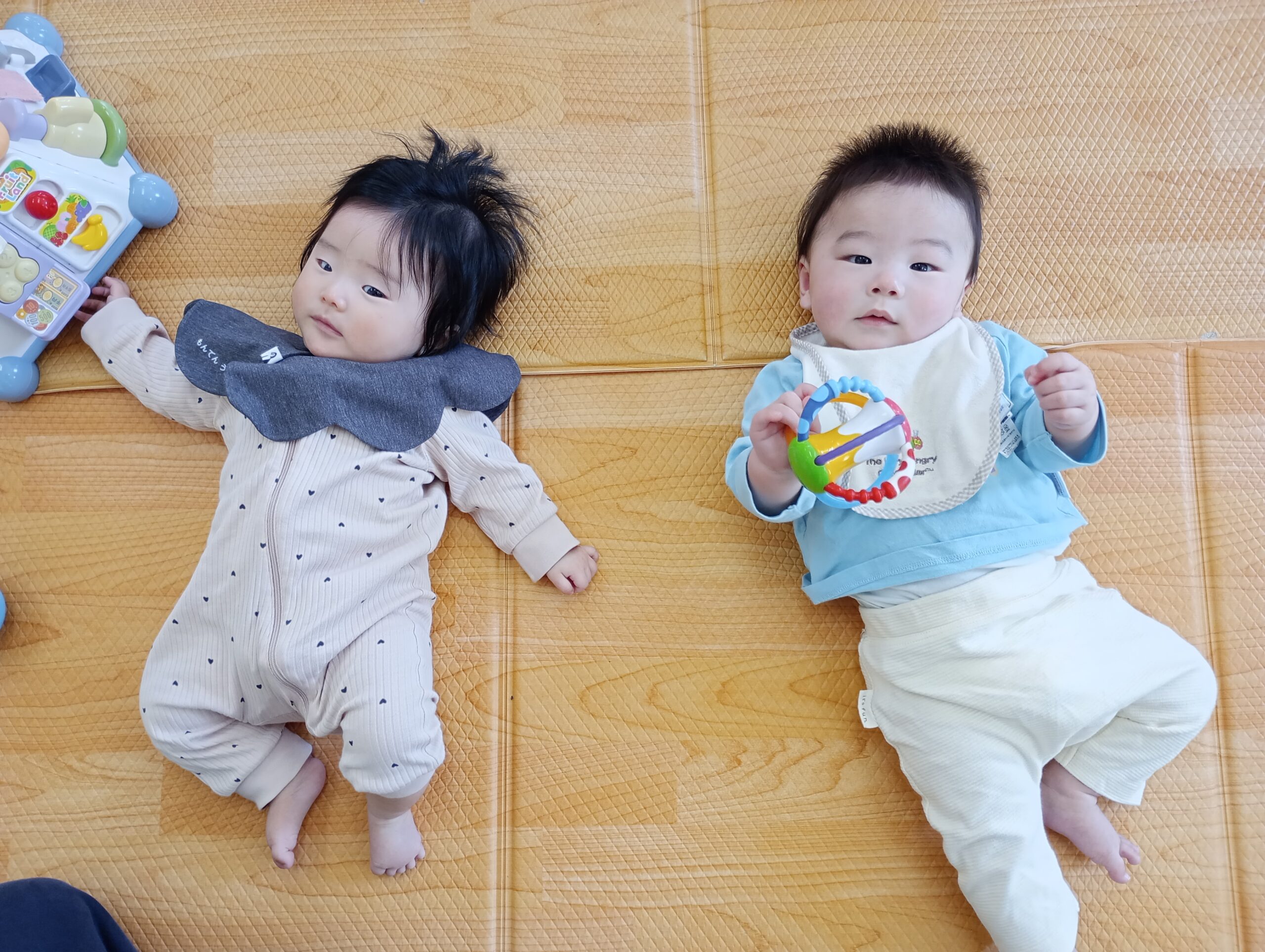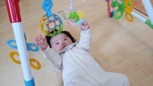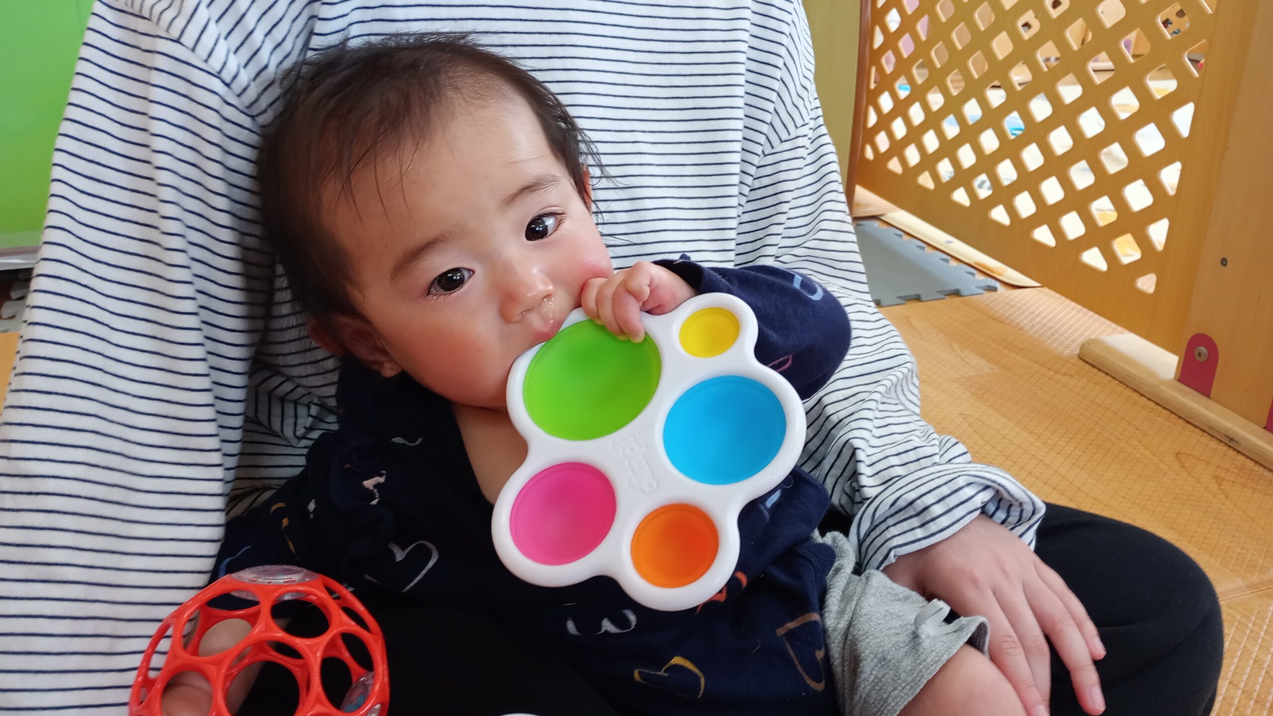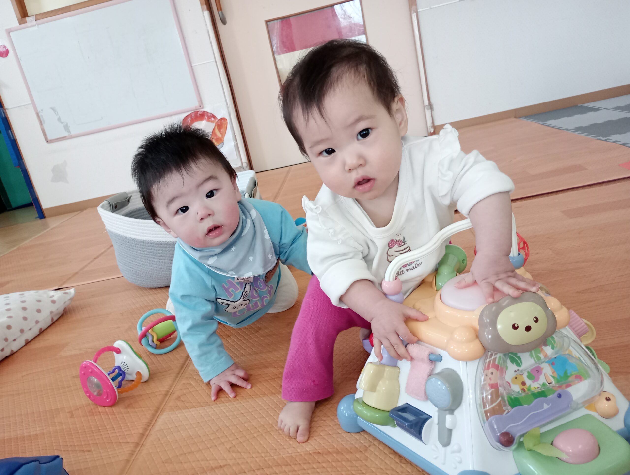 ぴよぴよさんのお友だちがおもちゃを持ってきてくれたり、いないいないばぁで笑わせてくれています😊