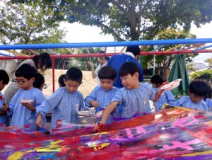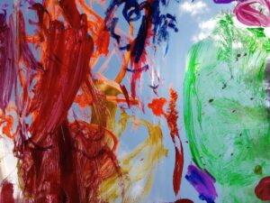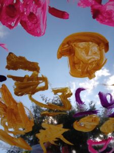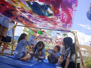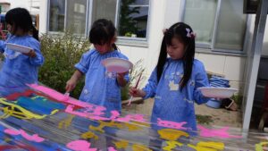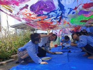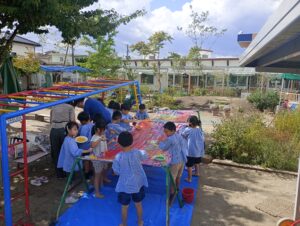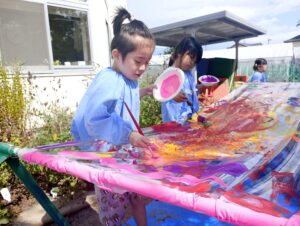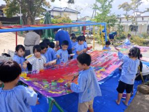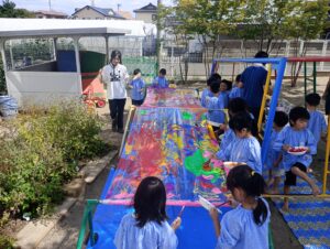 5歳児どんどん組が造形活動で、長いビニールクロスにアクリル絵の具で色を塗りました🎨