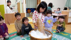 「よいしょー!よいしょー!」と掛け声をかけて一人ずつつきました。