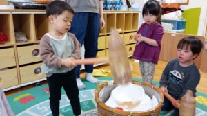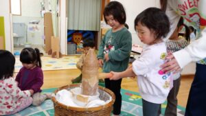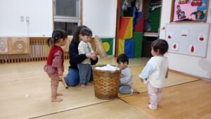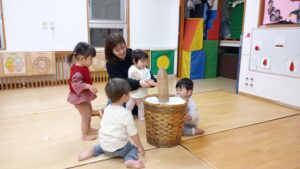 夕方に2歳児さんがもちつきごっこの道具を0・1歳児さんに貸してくれました。